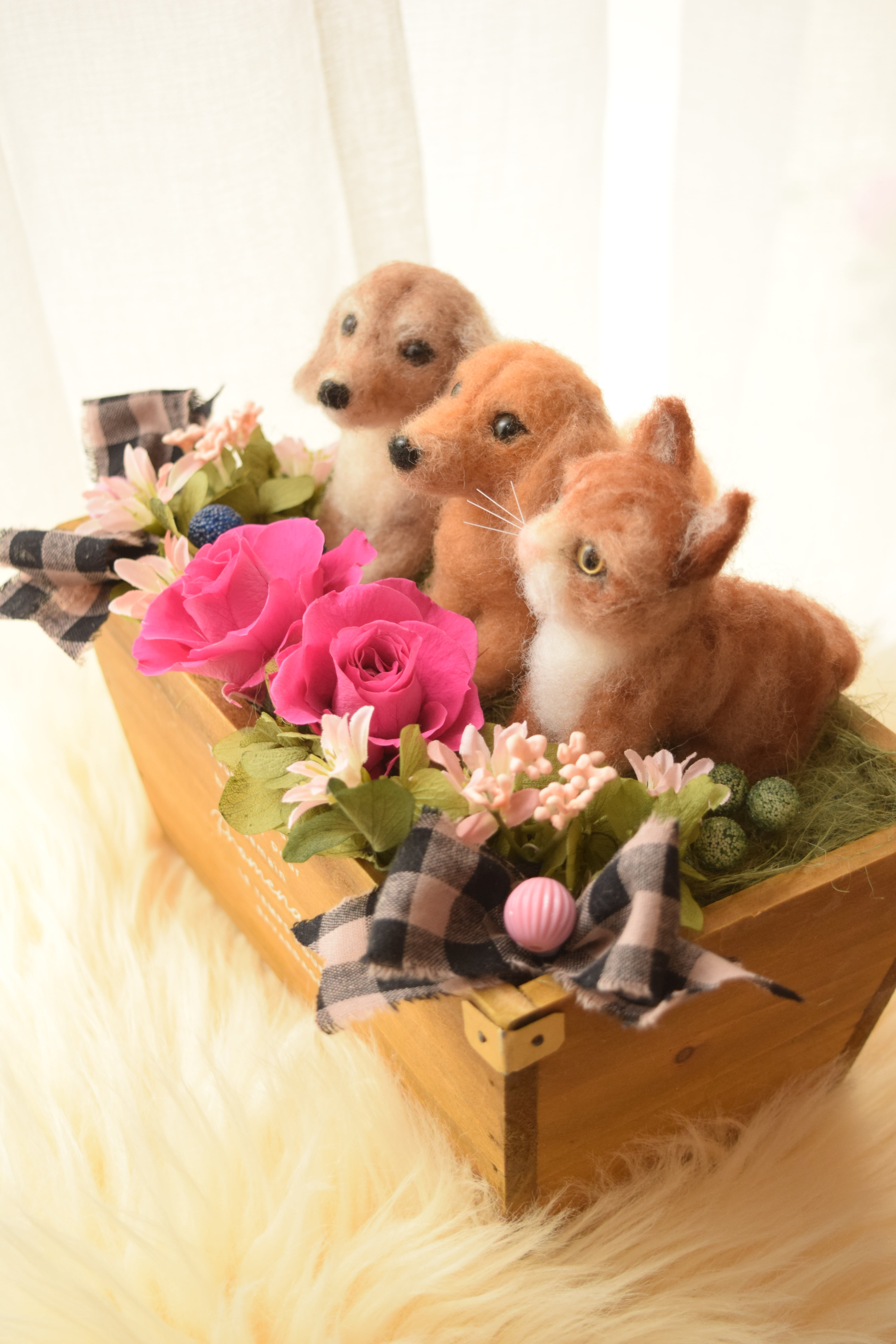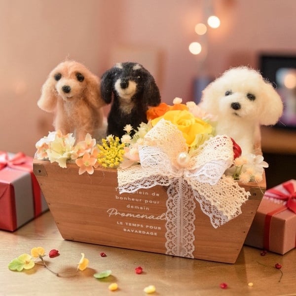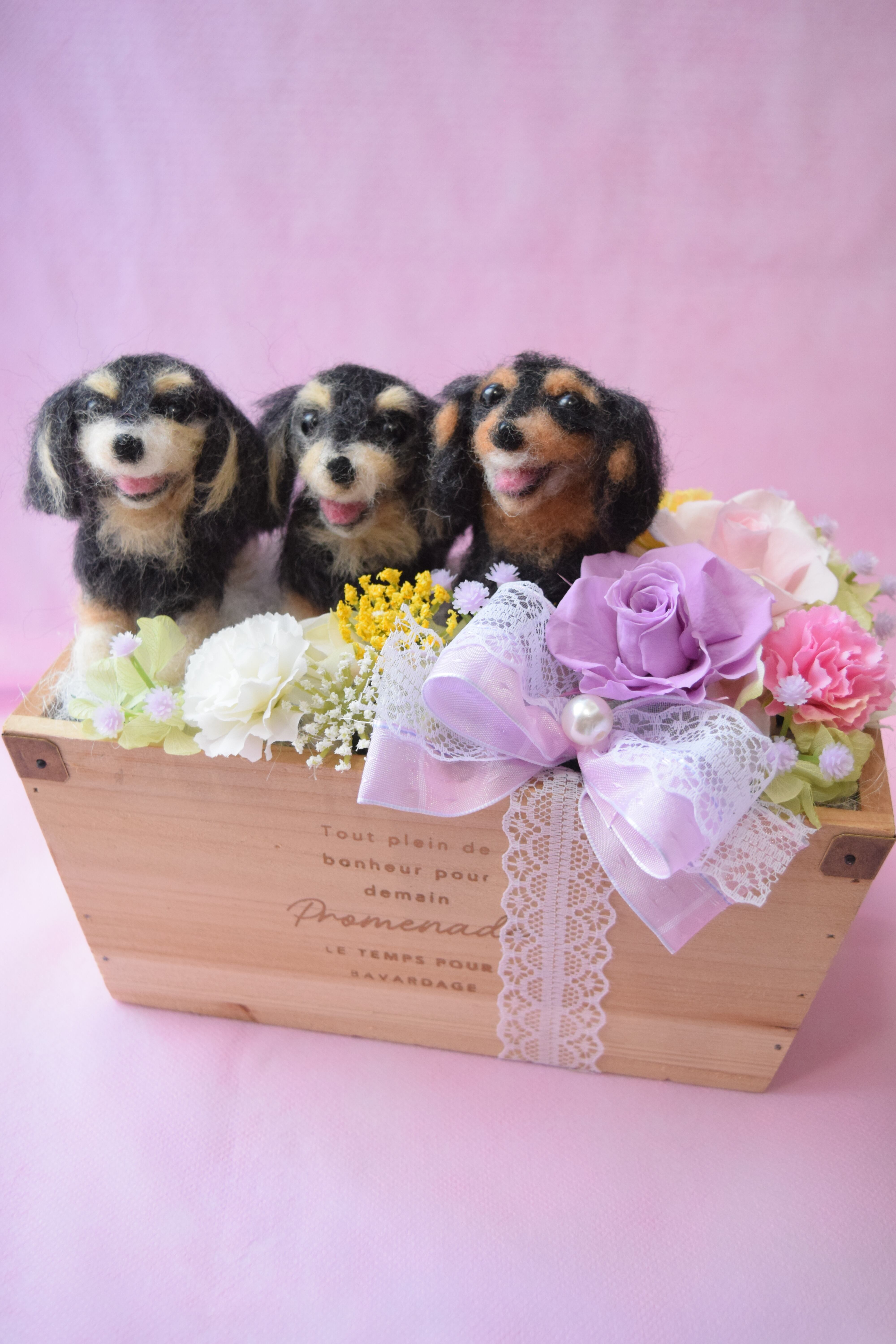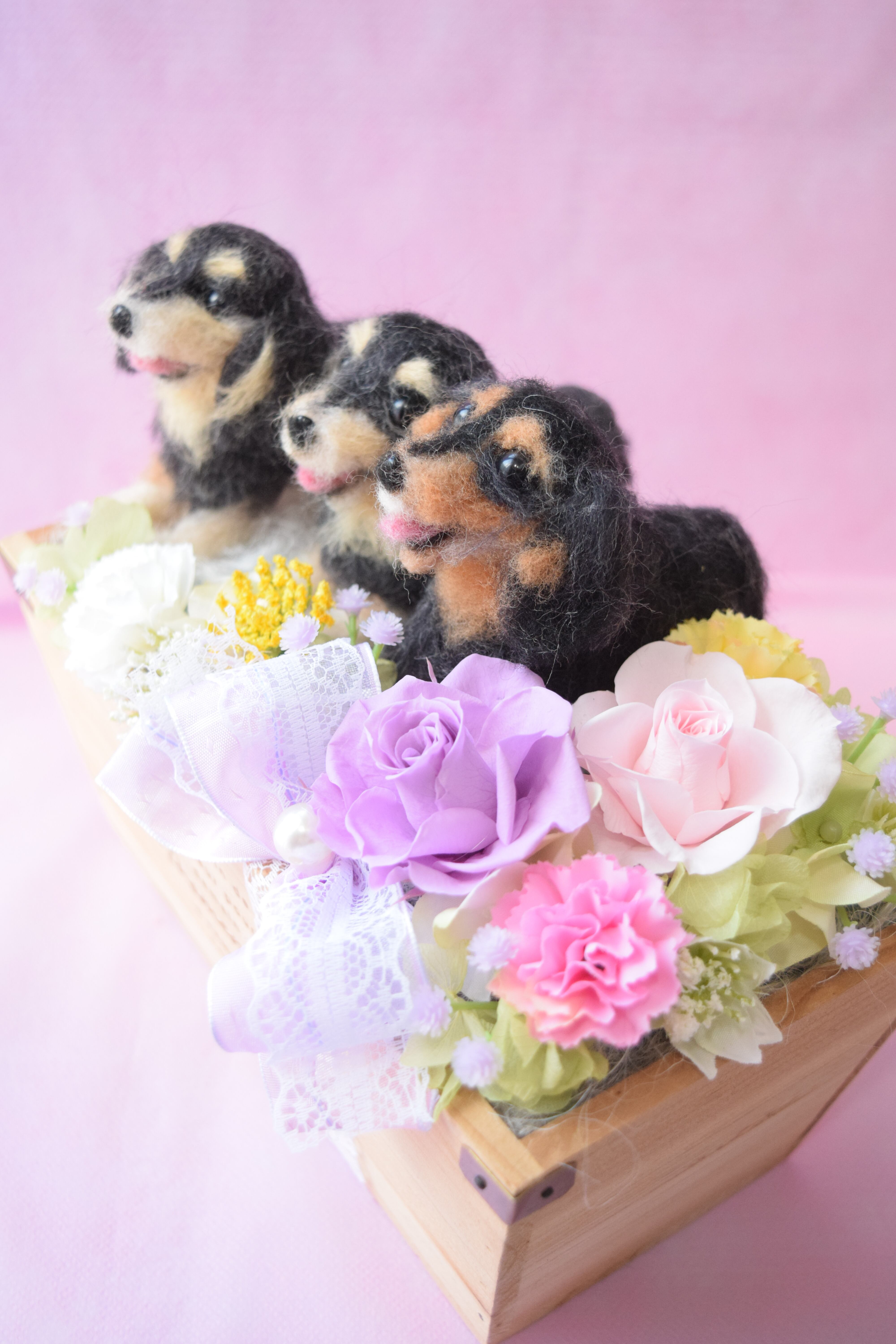 ドール3個とお花2輪【オーダーメイドで愛犬・愛猫の羊毛フェルト・お供え花やペットフラワーに】