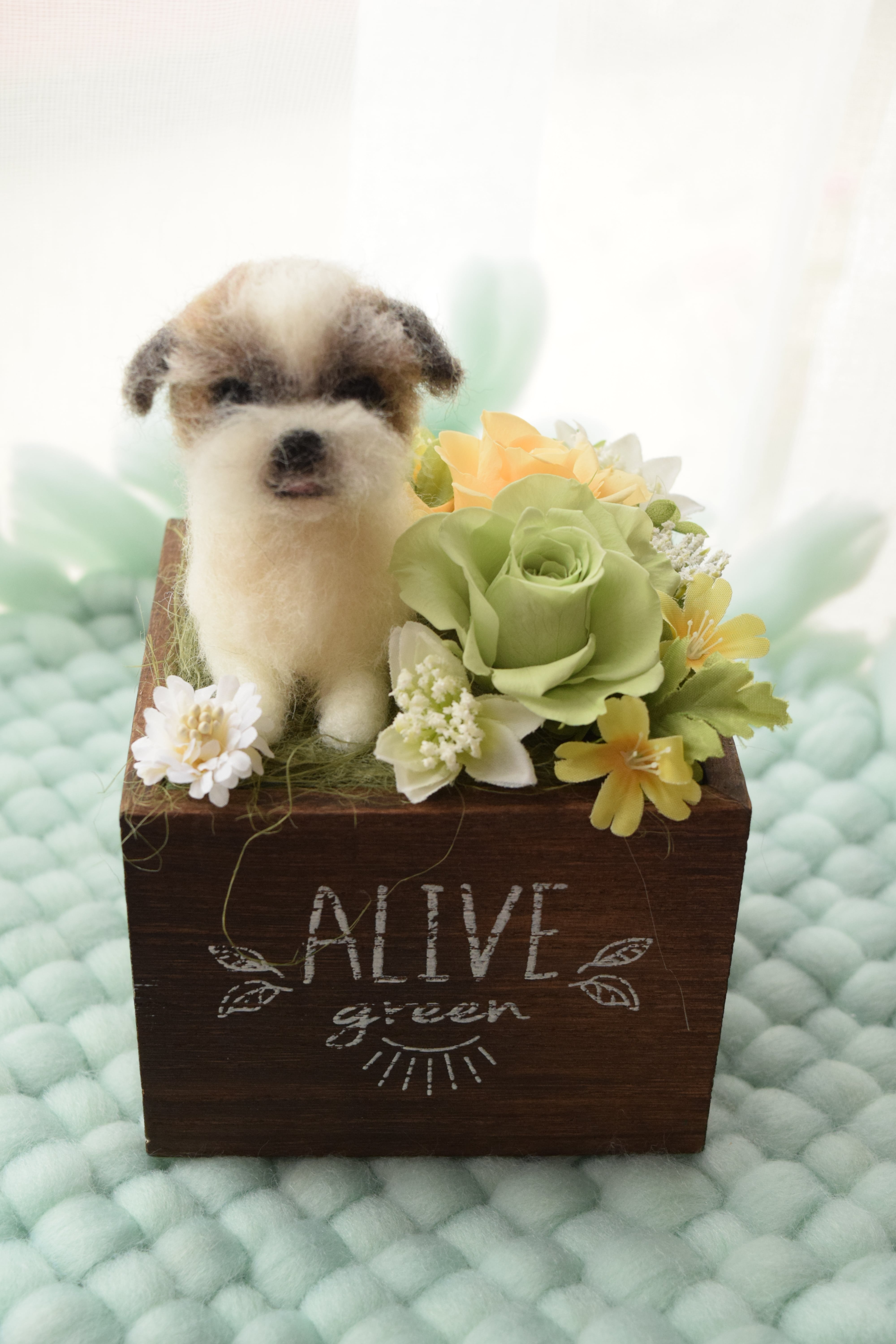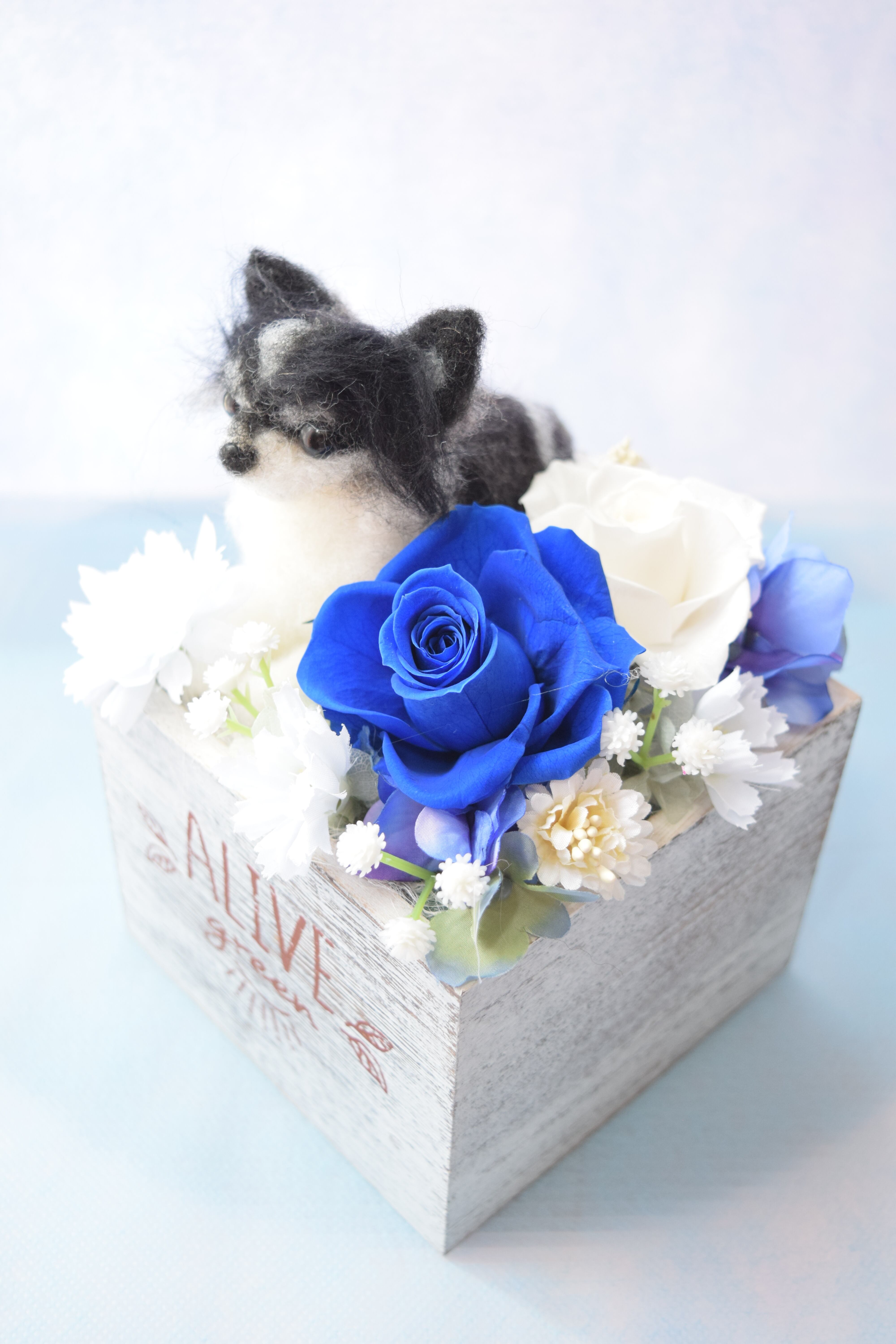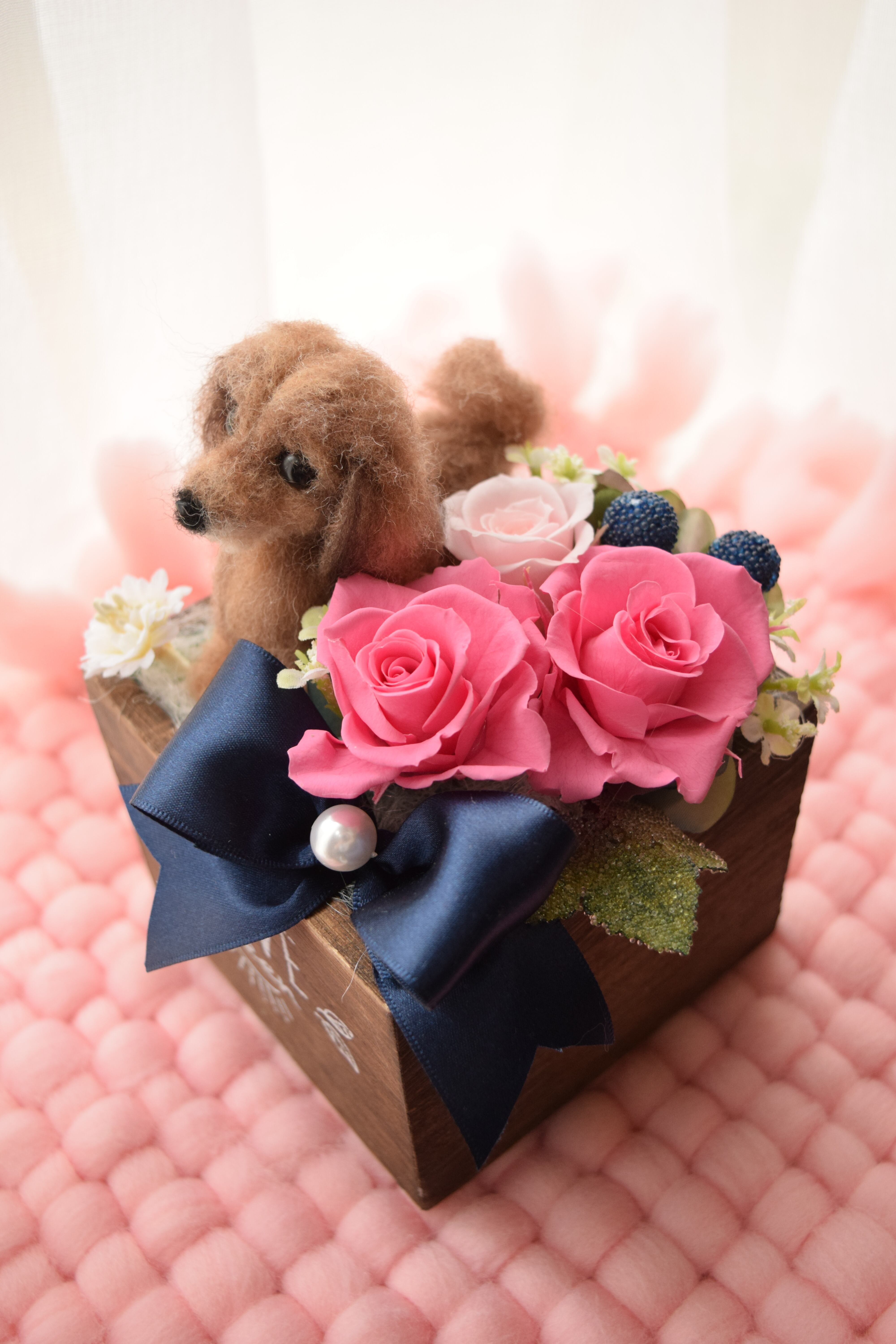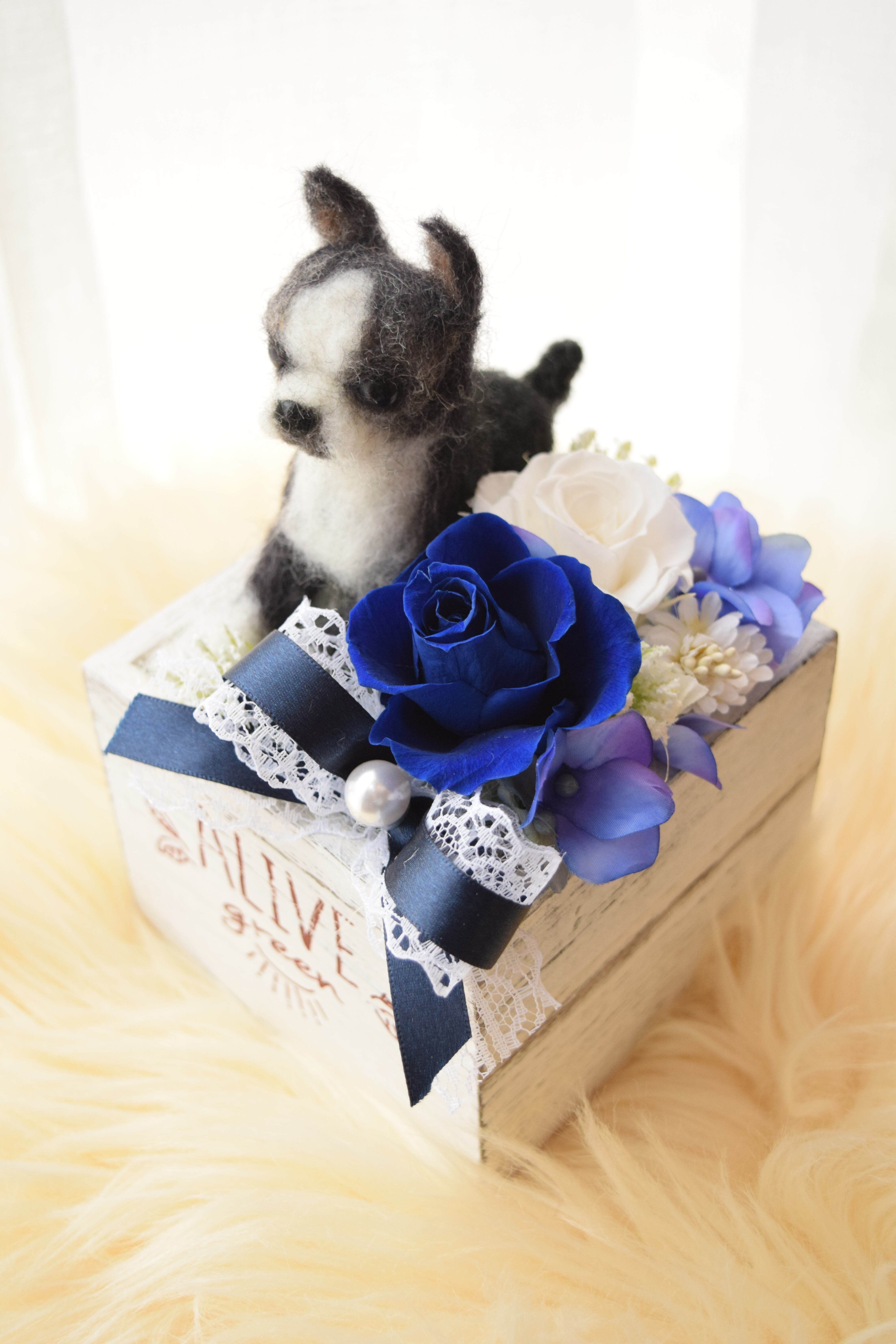 お客様から頂きましたワンちゃんのお写真を拝見し、羊毛フェルトで特徴を真似たドールをお作り致し、プリザーブドフラワーを飾る完全オーダーメイド作品です。