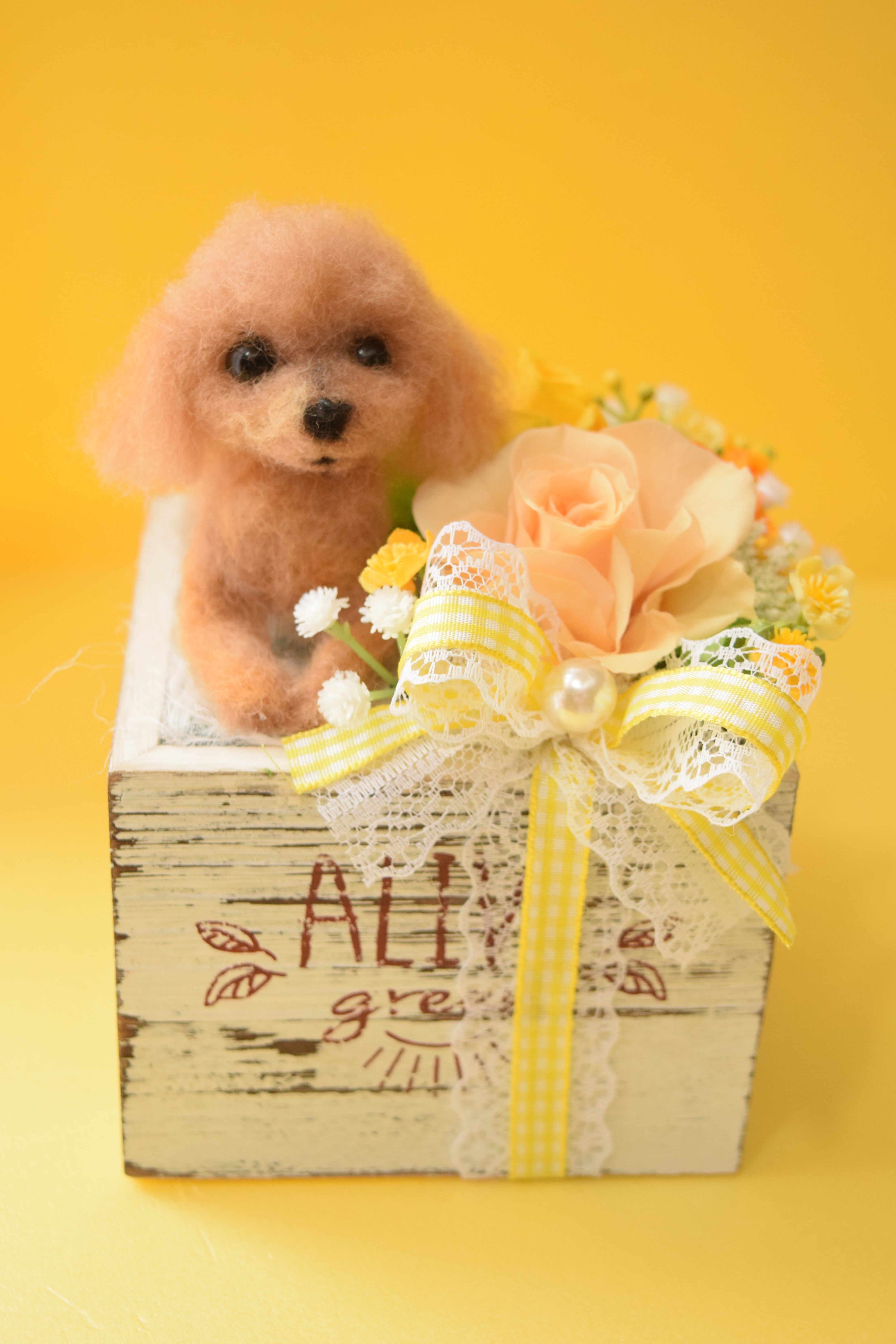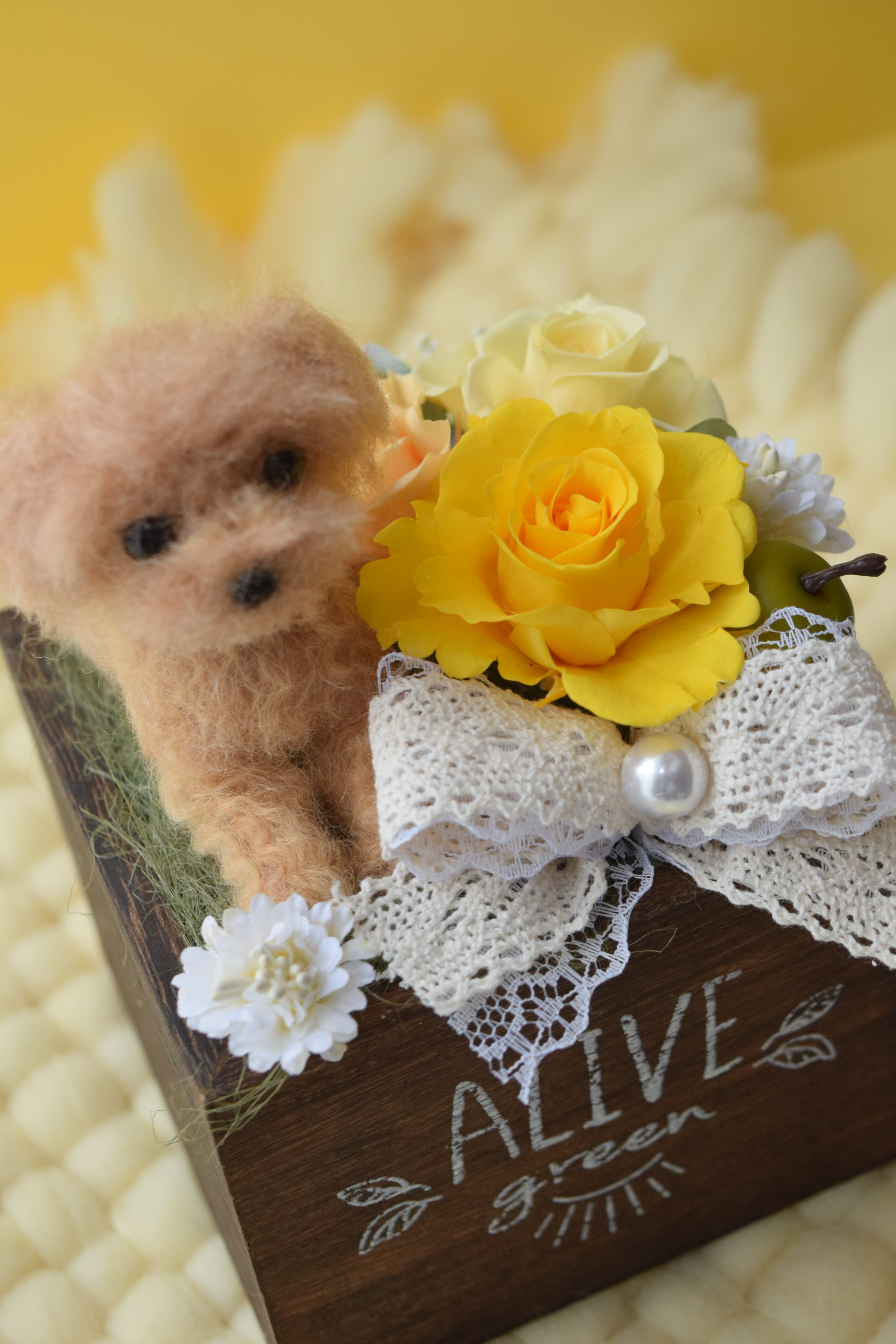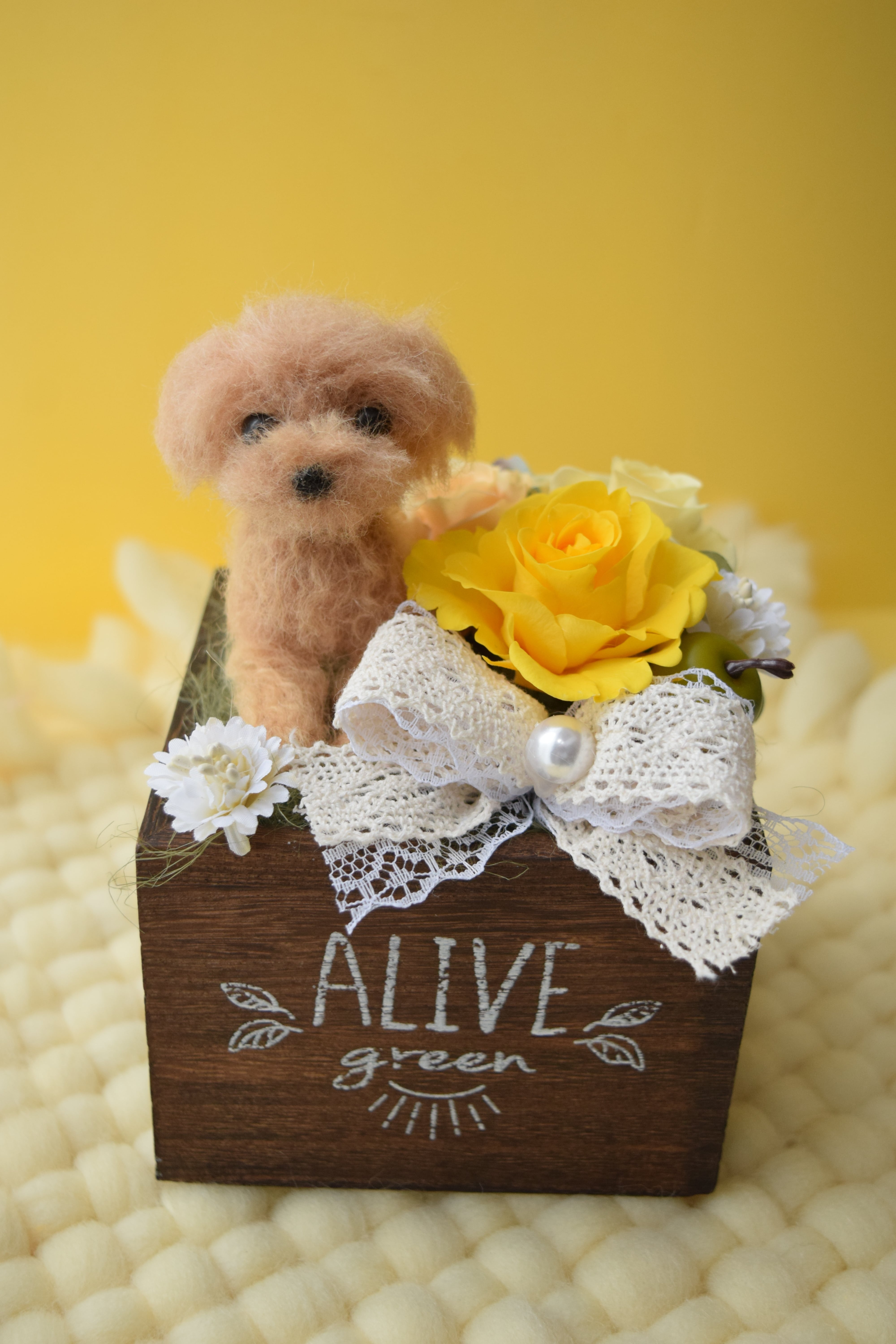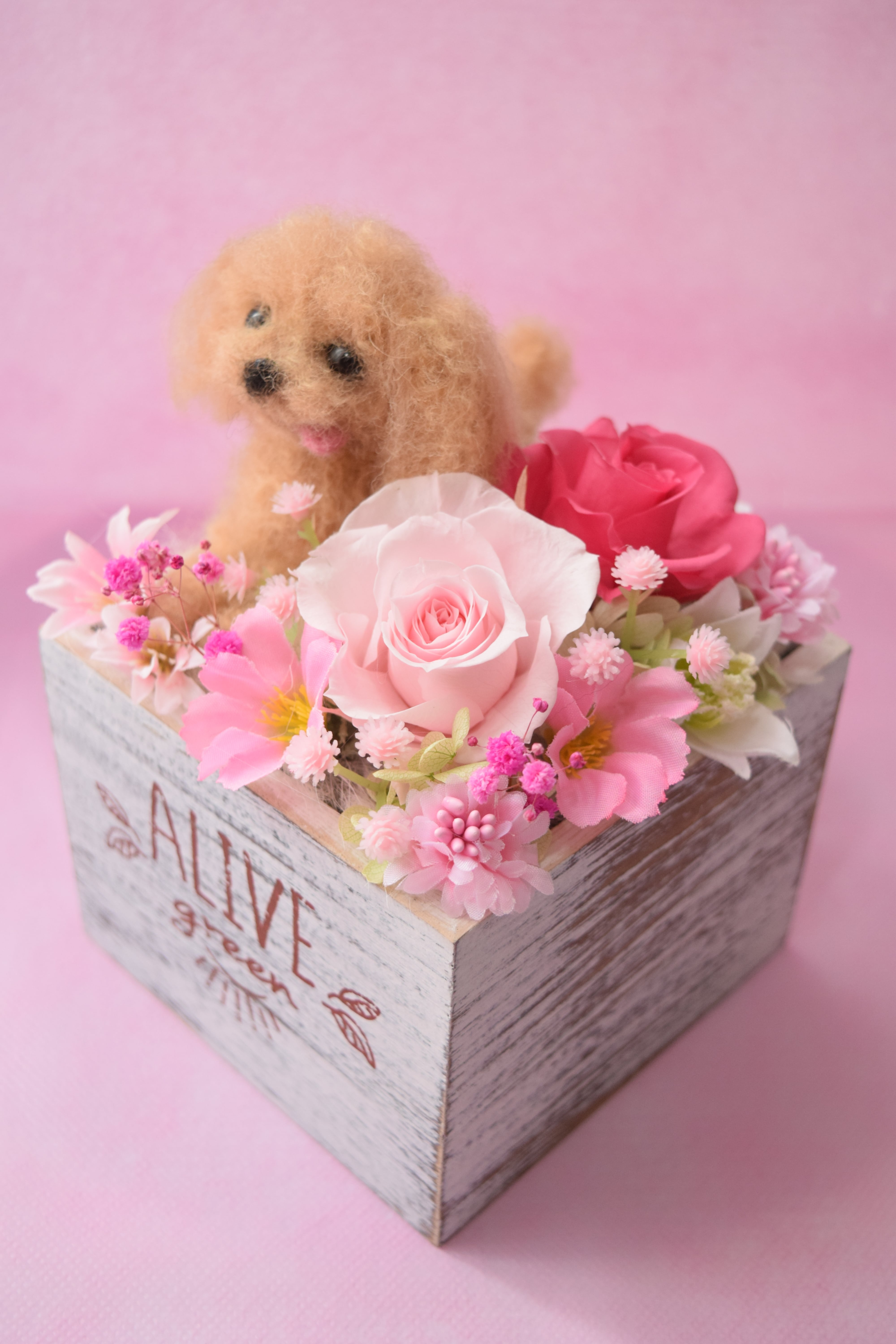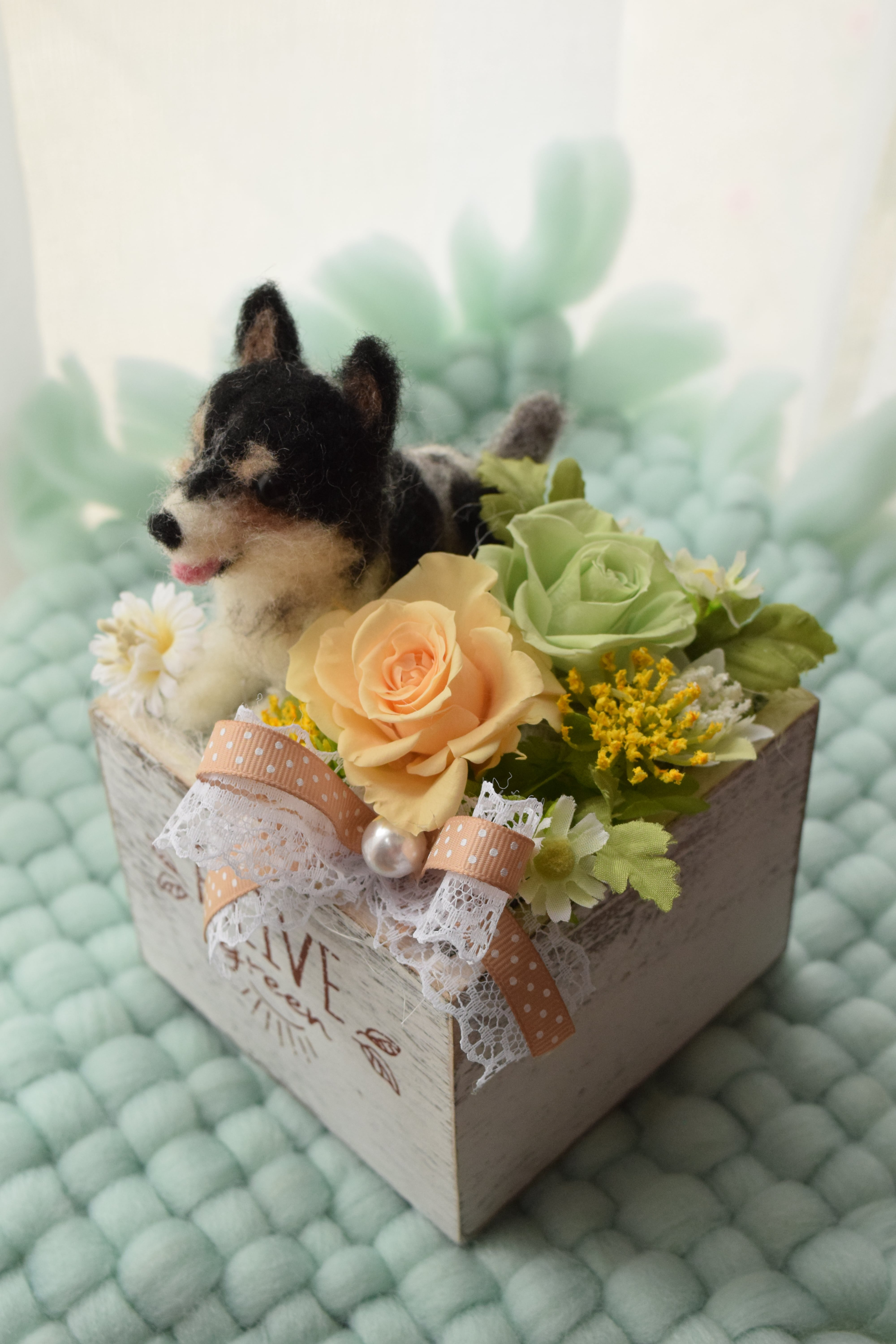お客様から頂きましたワンちゃんのお写真を拝見し、羊毛フェルトで特徴を真似たドールをお作り致し、プリザーブドフラワーを飾る完全オーダーメイド作品です。